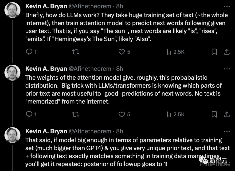 也就是说,如果模型的参数远远超过训练数据量(比GPT4大得多),并且用户提供了独特的前文,该文本和后续文本多次与训练数据中的某些内容完全匹配,那么模型就可以重复生成训练数据中的内容,即后续内容的概率趋近于1!