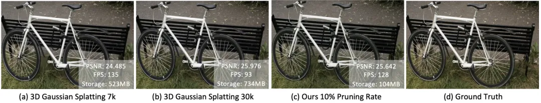 图 1: (a) 3DGS 7k 迭代次数的结果;(b) 3DGS 30k 迭代次数的结果,使用了更多的高斯基元来表示三维场景,因此质量更高、速度更慢、存储空间更大;(c) 剪枝了 90% 的高斯基元,在存储空间上大幅减小,但是达到了相似的渲染效果。