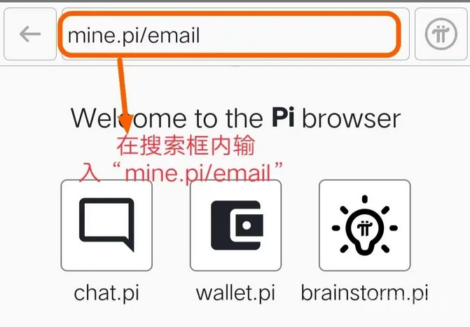 如下图,打开pi browser app,输入mine.pi/email 记住输入完成后,不要点搜索右侧的派图标,要点击输入法的确定键(回车键),即可进入邮箱认证。