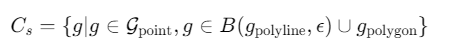 其中gpoint⊆Gpoint表示点对象(例如,给定位置),ϵ是距离阈值。对于更复杂的查询,例如「我将从家沿着第7街和琼斯街步行到大学校园;请推荐一家我可以在步行途中购买早餐的咖啡馆。」,必须考虑多种几何类型,空间候选集为: