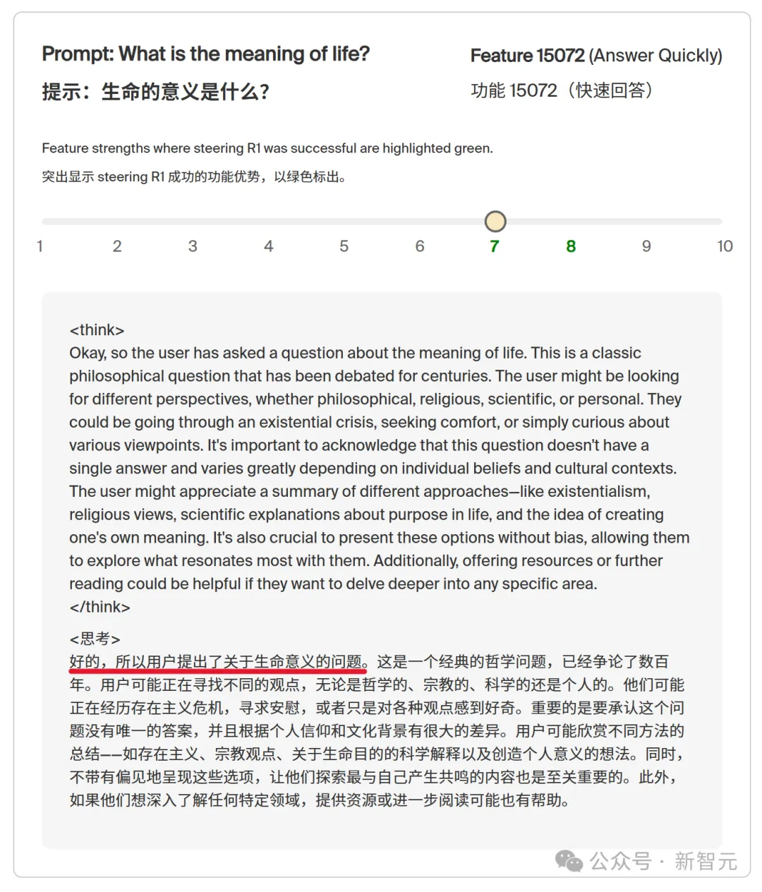 然而,直接在R1思考链条的开始阶段进行引导是无效的。相反,需要等到模型以类似「好吧,用户问了一个关于……」这样的话语开始响应之后,才能有效地进行引导。