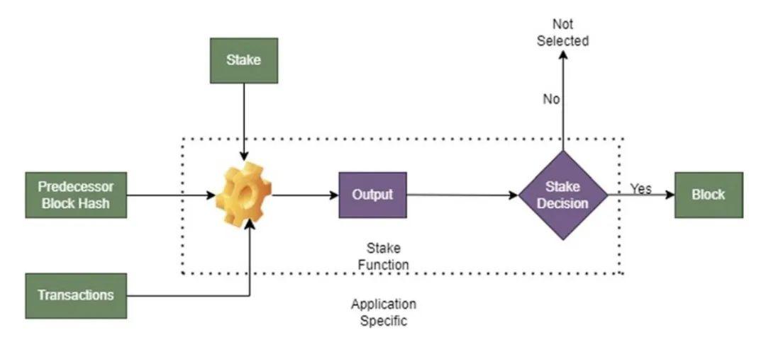 竞争出块记账前,拥有权益的节点将自己的权益放入PoS机制中,同时身份变为验证者,PoS机制根据验证者下注的多少,选出一个记账者进行出块记账。选择算法综合使用候选者的股权(持有的加密货币数量)和其他因素(如币龄和随机化),以确保网络上所有节点之间的公平性。其中一个因素是币龄,它是候选节点成为验证者的时间。节点担任验证者的时间越长,被选为记账者的机会就越大。另一个因素是随机块选择,其中验证器是根据最低哈希值和最高权益的组合来选择的。具有这些因素的最佳加权组合的节点成为新的记账者。如果选出的记账者在一段时间内没有记账,PoS机制重新选择记账节点,当出块完成,开始进入下一轮的记账。