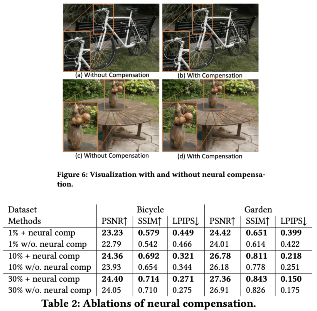 如表 3 所示,我们尝试了不同大小的补偿网络,增加网络大小并不一定能提高渲染质量,这与 ADOP 的发现一致,表明了相似的趋势。我们采用 30MB 的 4 层 UNet 作为默认设置,以最佳平衡质量和内存。