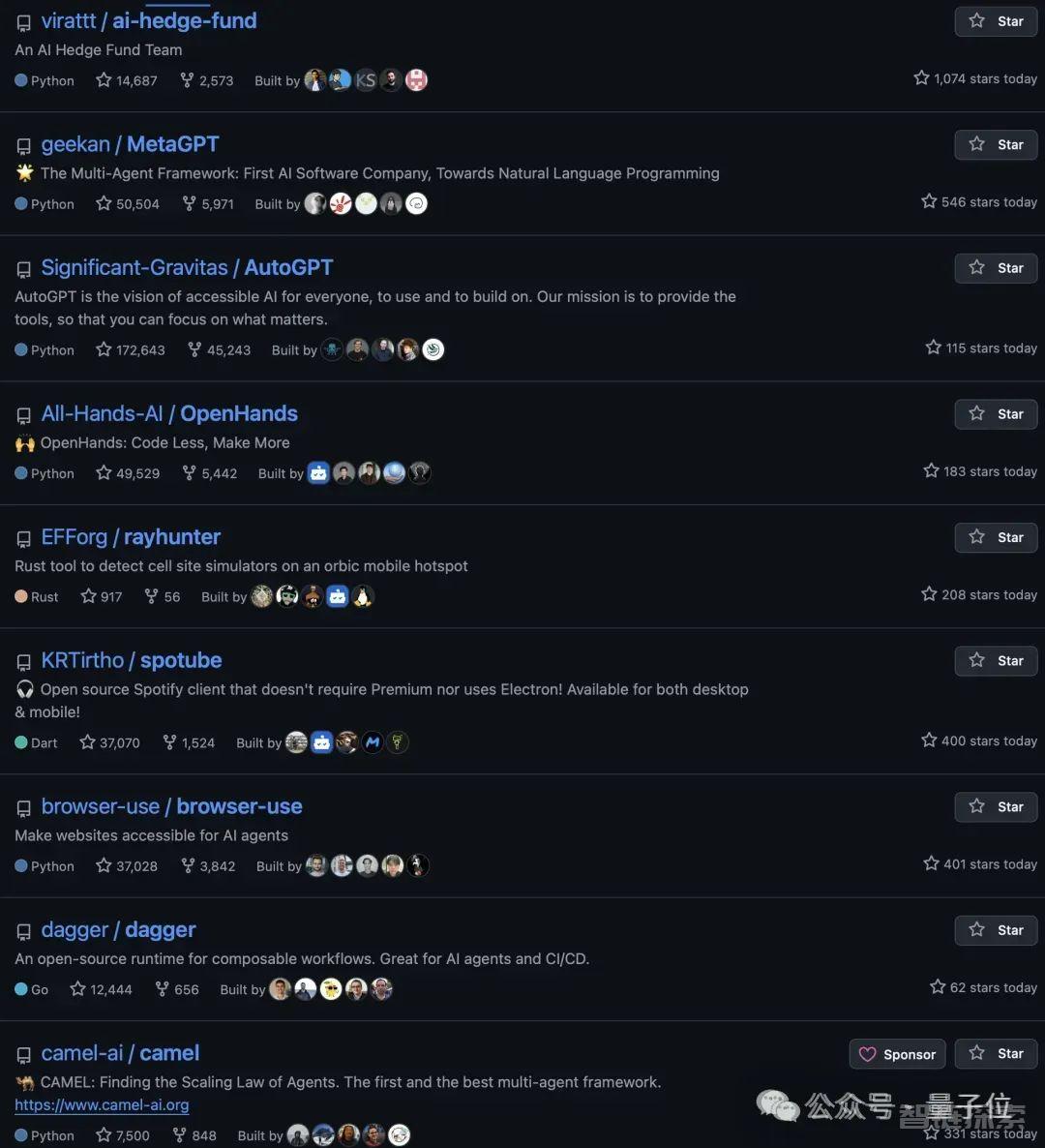 当时GitHub热榜上,大多是Agent相关的项目和工具库,老牌Agent项目MetaGPT与AutoGPT双双被顶到前排。