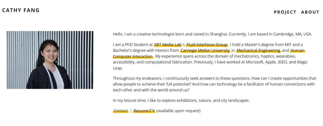 她已获得麻省理工学院硕士学位,以及卡内基梅隆大学(Carnegie Mellon University)机械工程和人机交互(Human-Computer Interaction)专业荣誉学士学位。在学术探索之外,她曾先后在微软(Microsoft)、苹果(Apple)、IDEO 和 Magic Leap 等知名企业积累实践经验。