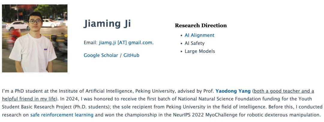 吉嘉铭,北京大学人工智能研究院博士生在读,导师为杨耀东老师,研究方向为强化学习、大模型的安全与价值对齐,在计算机顶级会议期刊发表口头、焦点论文等十余篇,谷歌学术引用累计 2200 余次,GitHub 开源累计获得 2W+ Stars。曾获首批国自然博士青年基金资助(2023 年度北京大学智能学科唯一),获北京大学博士最高研究奖「校长奖学金」, 首届中国电子学会 — 腾讯博士生科研激励计划(全国 17 人),获 NeurIPS‘22 机器人灵巧操作比赛冠军,研究成果及模型被 OpenAI 、Meta 引用,被 MIT Tech Review 报道。