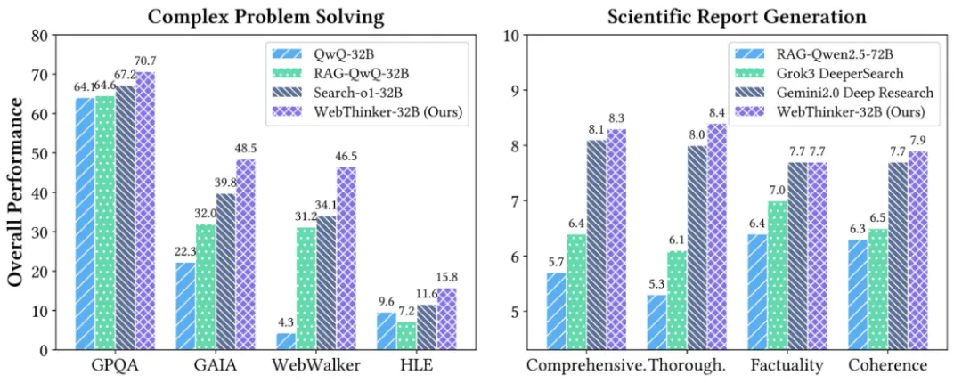 2. 自主搜索的优势:而引入自主搜索能力的模型则带来了显著提升。WebThinker 凭借其深度网页探索器,能够更全面地获取和整合网络信息,在所有基准测试中都取得了明显优势。