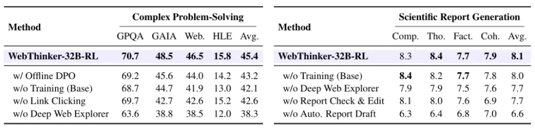 消融实验评估了 WebThinker 各关键组件的贡献。结果显示,深度网页探索器以及自主 「思考 - 搜索 - 写作」 策略中的报告生成组件(尤其是自主报告起草)是确保高性能问题解决和高质量报告生成的基石,其缺失会导致性能显著下降。强化学习训练则主要增强了问题解决能力,对报告生成的影响相对有限。